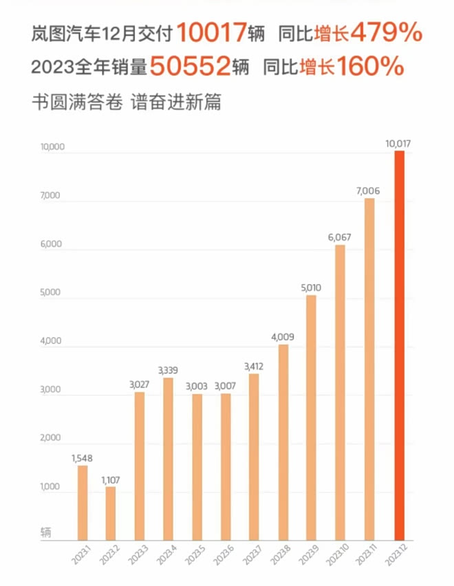 岚图交付上万!这是一个不断奋进,想要蝶变却屡屡备受压力的品牌,好在2023年最后一个月,岚图共交付10017辆,下半年开始逐渐攀升。尤其是12月岚图梦想家单月交付破5000,无论对于一款大型MPV还是岚图本身,都极具意义。