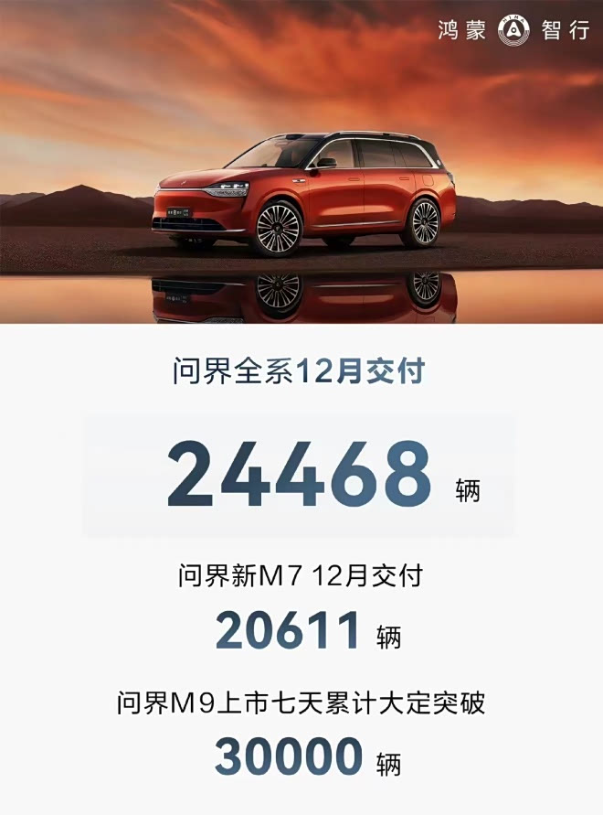 根据官方消息,问界新M7在12月交付新车20611辆,累计交付已达48552辆,问界新M7累计大定已突破12万辆。