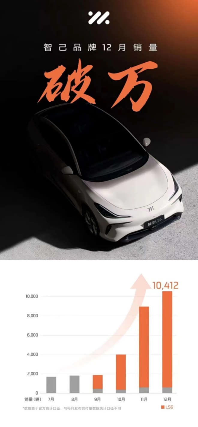 智己12 月销量达 10412 台,创历史新高。其中,LS6 车型蝉联 20 万以上全品类中国品牌纯电汽车冠军,妥妥黑马之姿。
