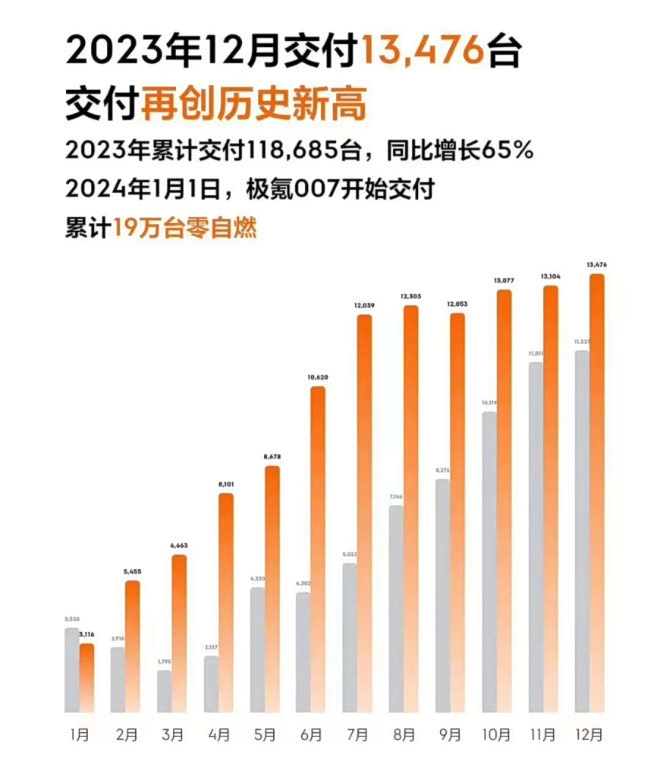 极氪2023年12月交付达13476台,同比增长18.9%,年度累计交付量达118685台,同比增长65%。截至目前,极氪累计交付突破19万台。