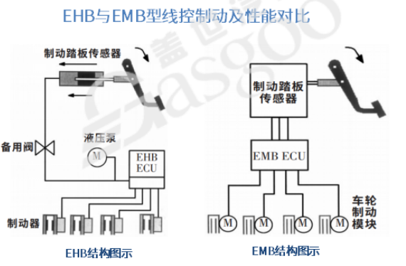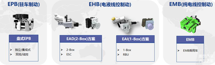 制动系统包括驻车制动与行车制动,驻车制动经历了由传统的机械手刹到电子系统的过程,行车制动系统经历从机械制动—液压制动—线控制动的发展阶段,线控制动正成为未来制动系统的主流方向。目前,线控制动主要分为电子液压制动(EHB)和电子机械制动(EMB)两种技术路线。其中主流的EHB技术又分为One-Box和Two-Box解决方案,One-Box较Two-Box性能上更具优势,但目前Two-Box安全性更有保障;EMB理论上更完美,但由于冗余备份、电机性能等限制,盖世汽车研究院预计未来5年内,仍将以EHB为主。