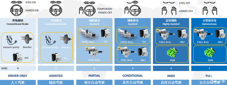 L1以下是传统的制动系统解决方案;L2部分自动驾驶,菲格科技的解决方案有两个,第一Two-Box ESC,第二One-Box;L3以上的自动驾驶解决方案是Two-Box ESC或One-Box RBU;在L4、L5以上,菲格科技将持续推进One-Box RBU或EMB。