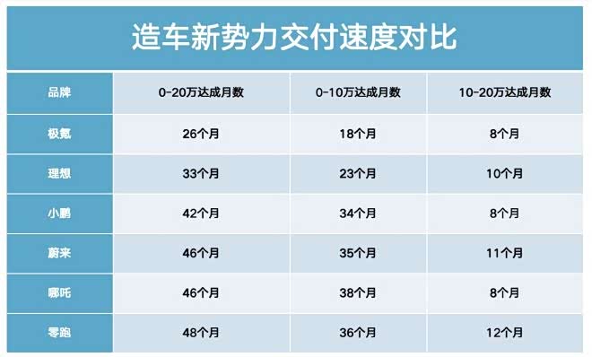 从0迈向20万辆的进程中,零跑汽车用了48个月,蔚来和哪吒均用了46个月,小鹏用了42个月,理想汽车用了33个月,而作为“爆款制造机”的极氪,却将这一进程缩短至26个月,刷新新势力最速交付纪录。