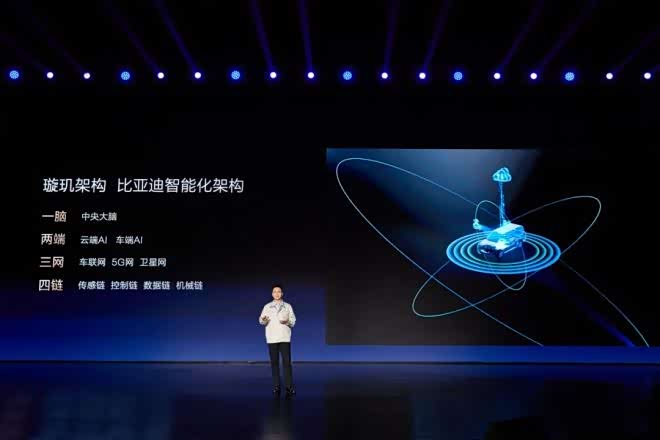 比亚迪集团副总裁、规划院院长杨东生介绍,璇玑架构由一脑(中央大脑)、两端(云端 AI、车端 AI)、三网(车联网、5G 网、卫星网)、四链(传感链、控制链、数据链、机械链)组成。也因此,王传福强调:“整车智能,才是真智能。”