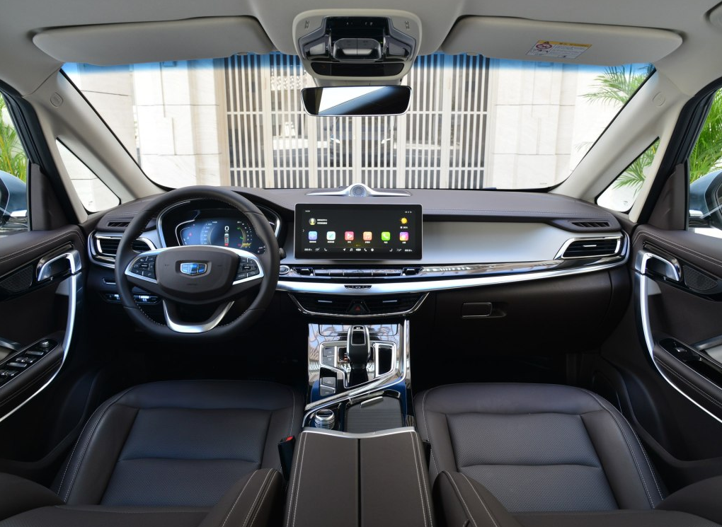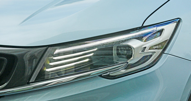 其前脸延用吉利家族设计元素,回纹涟漪式进气格栅与大灯融为一体,全LED大灯采用了单透镜一体式的设计,一长三短的灯条组成了LED日间行车灯。下方保险框的开口与线条设计让前脸更具立体感和力量感。当然,向后大角度倾斜的A柱让车身整体线条流畅,更显修长。