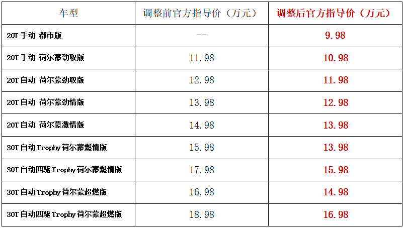 名爵HS于4月9日起全系下调官方指导价,30T车型下调2万,下订再送2万红包;20T车型下调1万,下订再送1.5万红包,同时新增一款售价9.98万车型。