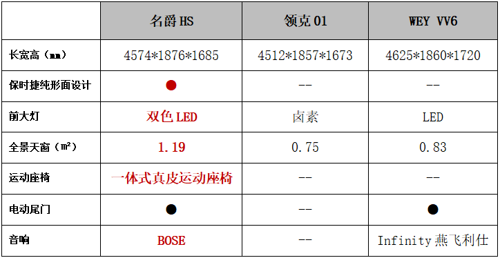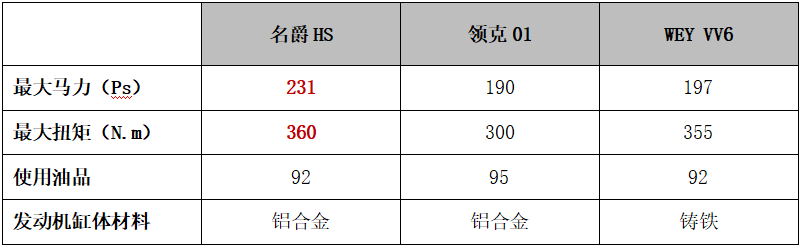 此次降价后名爵HS在市场中的竞争力如何?不妨选取国产高端SUV中关注度比较高的另外两款车型,领克01 2017款 2.0T两驱型版(官方指导价16.58万,以下简称领克01)和WEY VV6 2018款2.0T两驱超豪型(官方指导价15.5万,以下简称WEY VV6),与价格调整后售价14.98万的名爵HS 30T自动Trophy荷尔蒙超燃版(以下简称名爵HS)进行对比。