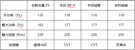 动力方面,全新名爵ZS搭载的1.3T双喷射涡轮增压发动机,最大功率163马力,最大升功率125马力,最大扭矩230牛·米,升功率和扭矩表现超越本田XR-V、缤智等车型,动力输出强劲。与该发动机匹配的是同级唯一的最新一代爱信6AT变速箱,技术成熟可靠,比本田XR-V的CVT和吉利缤越的双离合变速箱拥有更出色的驾驶平顺性。新车实测零到百公里加速仅需8.51秒,百公里刹停距离仅36.9米,优秀的加速和制动性能,在同级车型里非常具有竞争力。