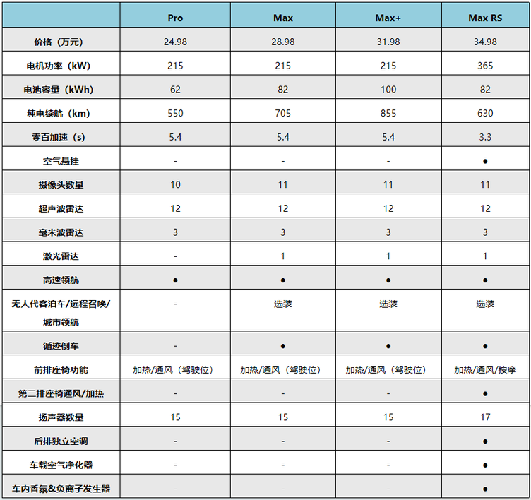 智界S7的四个版本,分别是24.98万的Pro、28.98万的Max、31.98万的Max 和34.98万的Max RS。四个版本的多数配置都一样,差异主要表现在续航、驾控体验和智能驾驶辅助水平等方面。