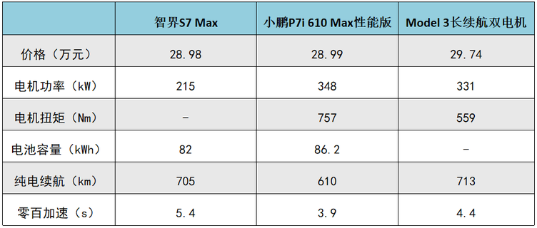 我们选取了三车价格相近的版本进行比较,分别是智界S7 Max、小鹏P7i 610 Max性能版和Model 3长续航双电机版。
