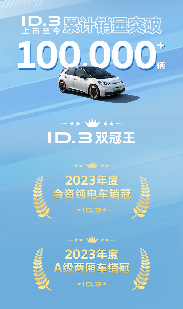 ID.3从热销到脱销,不仅让竞品破防,放在整个EV圈也是让人羡慕。数据显示,其2023年全年同比销量增长215%,位列2023年合资纯电车销冠和A级两厢车销冠,上市至今累计销量突破10万 辆,成为当仁不让的“新能源黑马”。