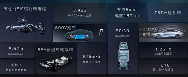 动力方面,新车搭载全新一代高性能碳化硅电驱,零百加速仅需3.49秒,麋鹿成绩(紧急变线)更是高达82km/h,直接对标百万 跑车,而它的转弯半径却只有5.62m,只比两厢的高尔夫多出一点点,如果不是明确告诉你它是一台身长超过5米的四门三厢大轿车,你怕是会想这货肯定是台超跑吧!