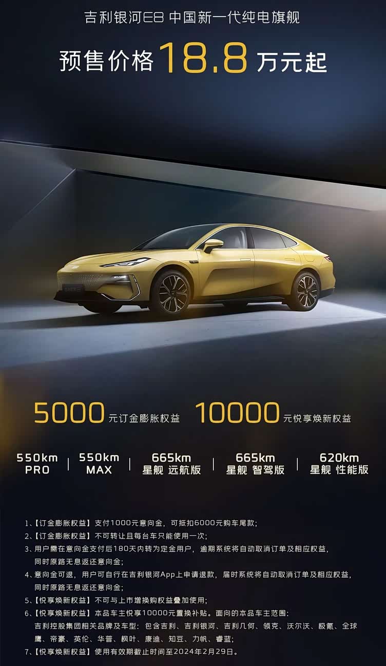 就在不久前的2023吉利汽车用户大会上,吉利汽车以“我们的Dream Car”的名义,为吉利在全球的1400万车主带来了旗下的纯电旗舰轿车银河E8,并正式开启了全球预售。据悉,新车将推出550km Pro、550km MAX、665km 星舰远航版、665km 星舰智驾版、620km 星舰性能版共5个版型,预售价格为18.88万元起,并确定于2024年1月正式上市并交付。