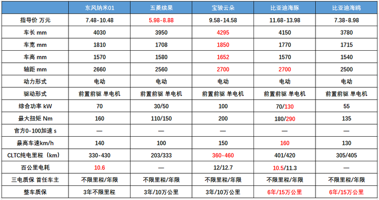 从下图中可以清楚地看到,若论同价位车型,纳米01的车身尺寸明显比五菱缤果、比亚迪海鸥大一圈,动力性能也是明显占优;而跟尺寸大半级的宝骏云朵和比亚迪海豚相比,在续航里程没有明显拉开差距的前提下,纳米01的售价则明显更具优势一些。