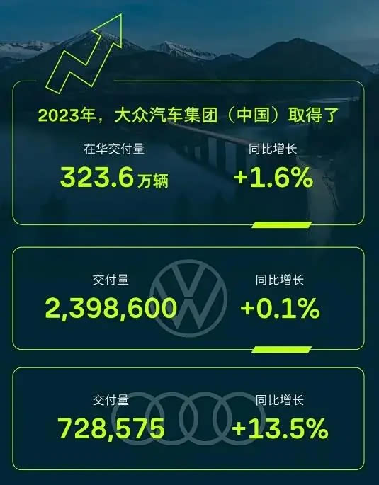在大众集团旗下,2023年大众品牌及 捷达子品牌在华销售了240万台,奥迪销售了73万台。其中燃油车交付了大约300万辆,纯电动车交付了约19万台。