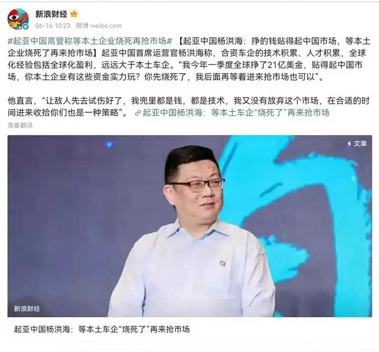 所以起亚中国的杨洪海才会很有底气说:“我今年一季度全球挣了21亿美金,贴得起中国市场,你本土企业有这些资金实力玩?你先烧死了,我后面再等着进来抢市场也可以。”