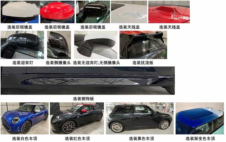新车将提供轮辋、侧后玻璃、Logo、前饰框、前盖饰条等多个选装配置,并提供白色、红色、黑色和渐变色四种车顶可选。