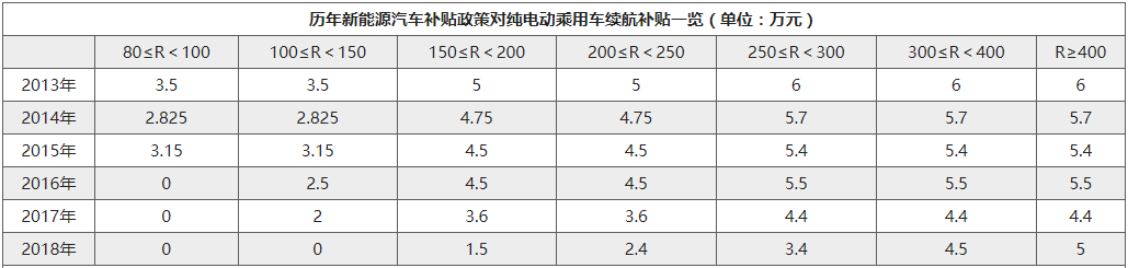 上表汇总了从2013年到2018年根据续航里程划分的国家补贴数据,从中我们可以看出如下规律:无论哪个里程区间,补贴的额度都呈下降趋势,不过低续航区间的补贴额度下降幅度最快,而高续航电动车所对应的补贴额度较抗跌,甚至还有上涨的情况出现。目前也有消息指出今年的补贴政策将会取消地方补贴,如果属实或许意味着即便高续航电动车,享受的补贴额度也会有较大幅度的下跌。